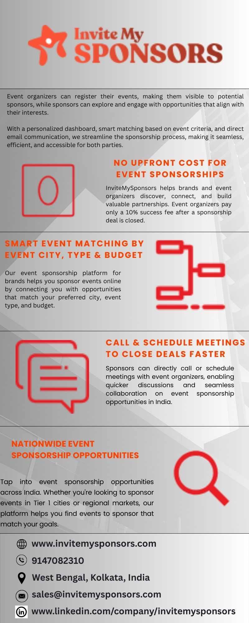 Find and connect with global event sponsorship platform for brands to highlight your brand! Our platform directly connects various brands with the event to offer various opportunities for the sponsorship and promotions.